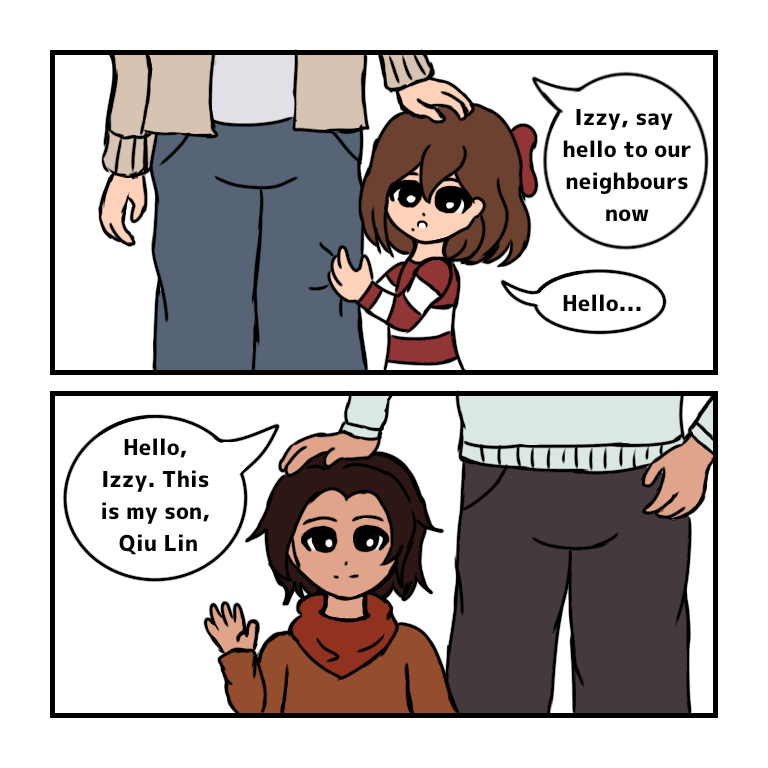 I wanted to draw a much younger Izzy and Qiu so i made this what if scenario where Opal and Izzy moved to Golden Grove much earlier than in the game and they were currently introducing themselves to the neighbourhood.