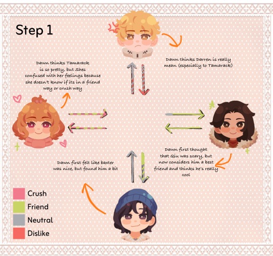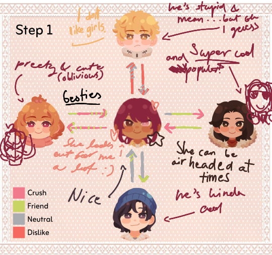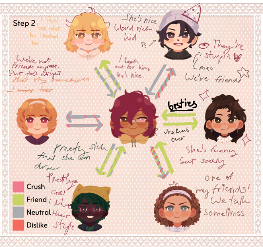 Helloooo my mc is still in development, i have an entire google doc and everything (im so hyper fixated) i just don't have access to the game atm 😭 so i cant do their descriptors, or character thing but i saw someone do a relationship chart and i thought it would be fun to do that (ill update with their character when i get access to the game)