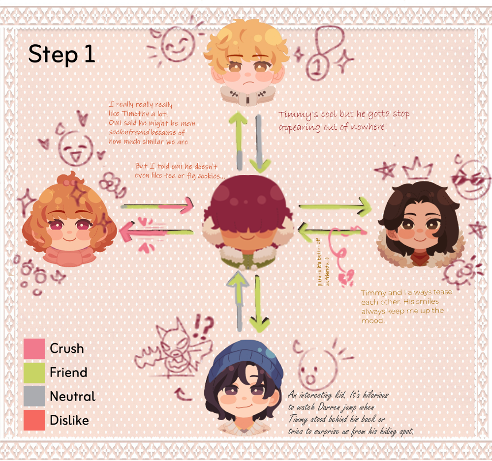 I also decided to do Timothy's relationship chart to summarize his interactions he had with the characters! Inspired by cheapcoconutjam and vivistreehouse for their MCs' charts <3 and template belongs to @marzopan-art from Tumblr!