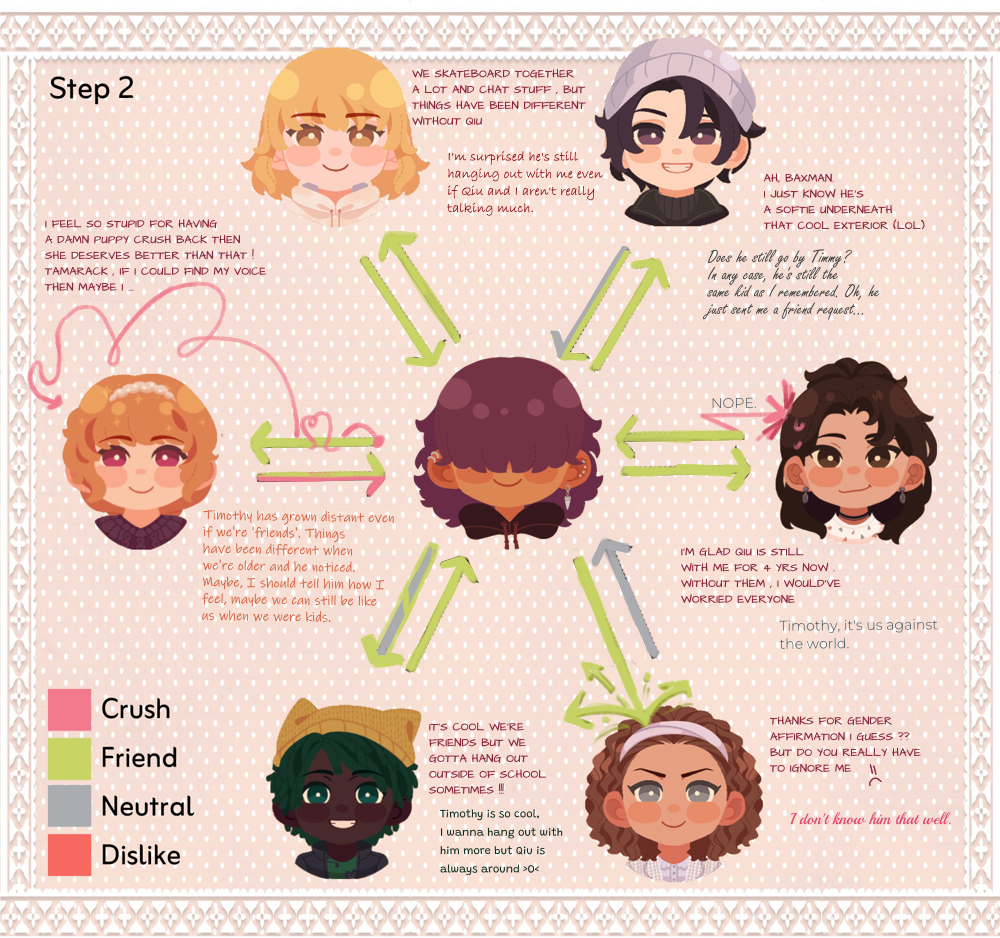 Step 2: Here we get to see Timothy's thoughts about all of them <3 I was having a hard time for Serenity because they only appeared in the step 2 prologue, giving me the impression they're more of Tamarack's friend (or Tamarack and MC's friend) but not MC alone(?) So Tim's in between friendly-neutral to Serenity. I had a funny headcanon because Qiu is often seen with Tim, they (unintentionally) scared off Serenity away lol. But I hope we get to know them more in Step 2 moments like how we befriended Ren and Baxter in Step 1!