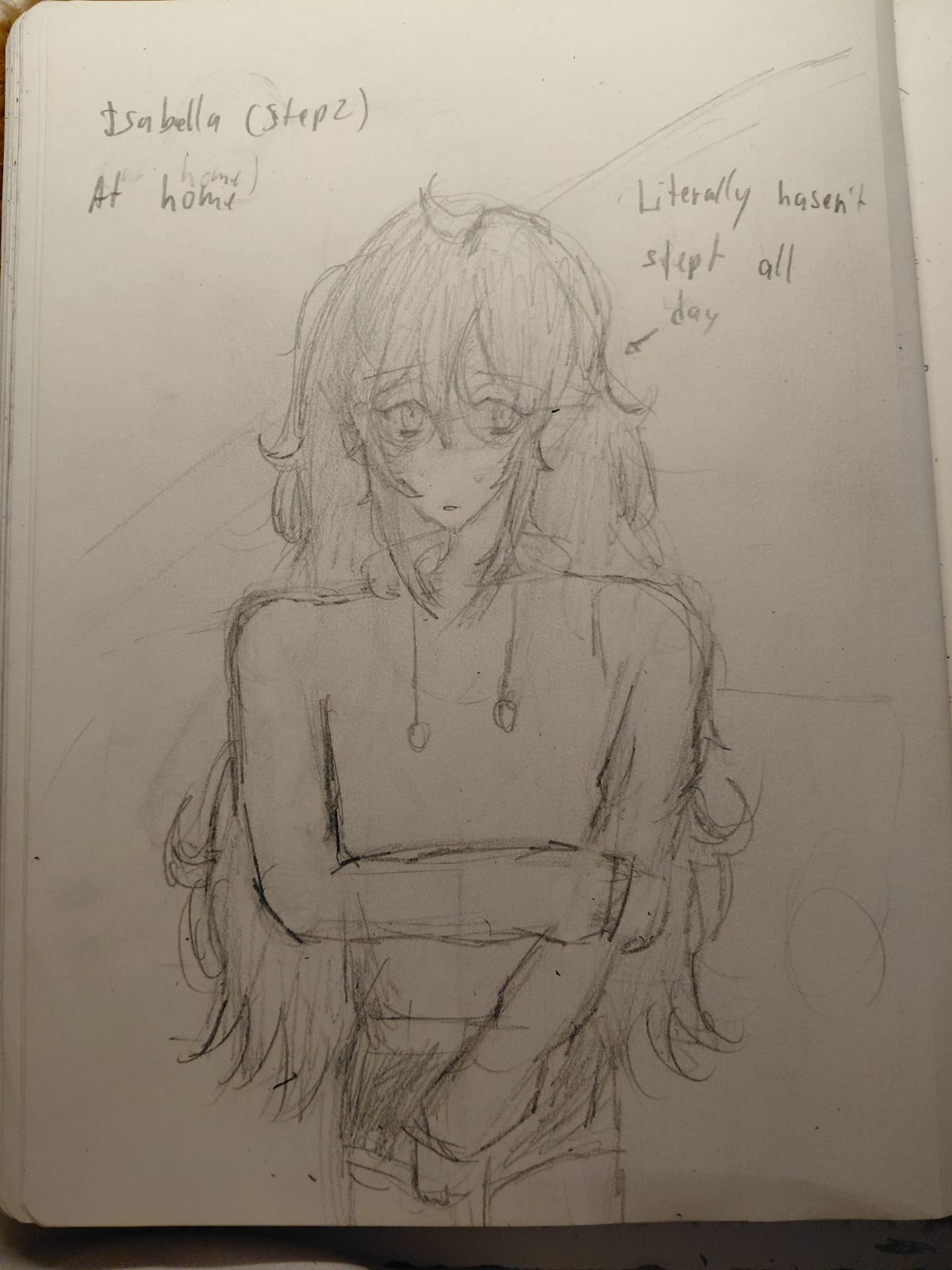 Oh, yea fun or not so fun facts about her: In step 2 Isabella sometimes or most of the time lacks sleep so that's why in my sketch she looks tired...